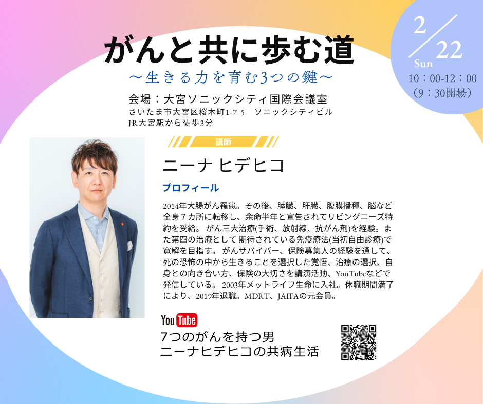 がんと向かい合いながら生活を続け、その経験をもとに講演や発信を続けておられるニーナ ヒデヒコ氏による「がんと共に歩む道~生きる力を育む3つの鍵~」の講演会を開催します。
