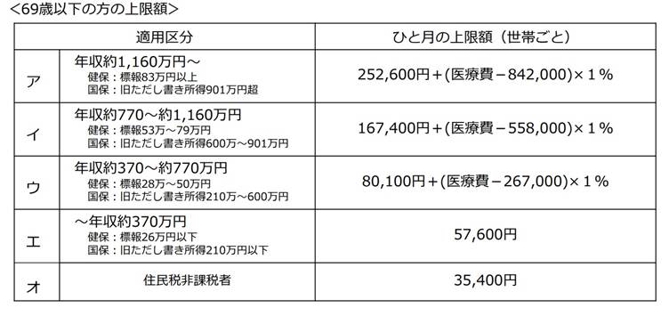 日本には高額療養費制度があり、公的医療保険の対象となる医療費の1か月あたりの自己負担額が一定の上限額を超えた場合、超えた部分の額が払い戻されます。上限額は所得区分により異なっており、69歳以下の方の上限額は次のとおりです。